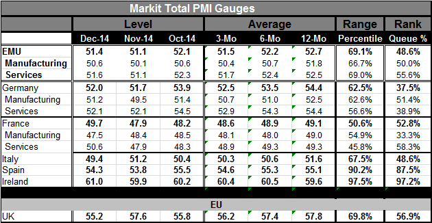 Even a relatively quick perusal of the EMU trends reveals that deceleration is well ensconced across the euro area. Reading the table from right to left, the 12-month to 6-month to 3-month averages by country and by sector are overwhelmingly getting progressively lower on the more recent horizons. Even the latest month's reading is generally in line with or below these receding trends with few exceptions. Europe is weak and it is weakening. The euro area's overall raw diffusion measure at 51.4 in December bravely stands above the neutral reading of 50.0. But at that level, it also stands meekly in the 48.6 percentile of its historic queue, below its historic median. The EMU reading is higher than this more than half the time, marking this as a weak reading, albeit one that still is signaling growth. And with a trend that is about to splash cold waters on those failing embers.