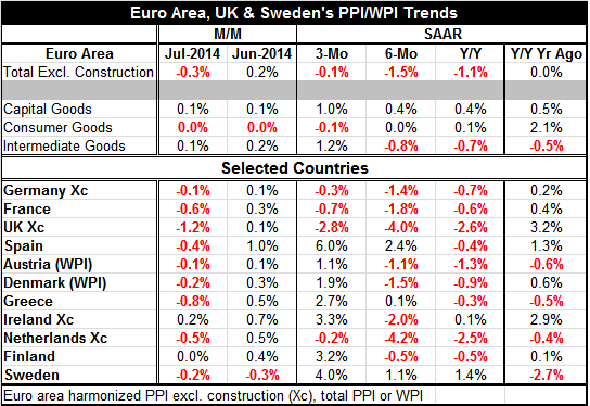 We see continued PPI weakness because of ongoing weakness in manufacturing. Germany's manufacturing PMI for August reported yesterday was last lower in September 2013. Even France, a country that has been struggling, saw conditions worsen; they were last weaker in May 2013. Italy's PMI was last weaker in June 2013. Spain was last weaker in April 2014. That is a lot of weaknesses in the big four EMU members. There can't be too much surprise that producer prices are slumping again.