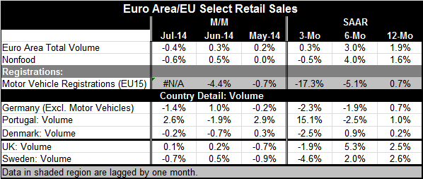 Euro area retail sales backed off in July as overall and ex-food sales fell. Both sales flows accelerated over 6-months compared to 12-months but then decelerated over 3-months compared to both six-months and 12-months.