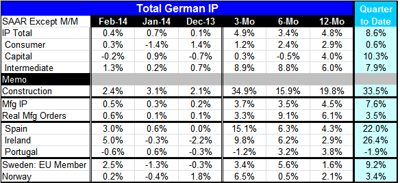 The table shows the specifics. In February German industrial production rose by 0.4% compared with a 0.7% increase in January. Those two gains combined show a growth rate over the fourth quarter yielding an 8.6% annualized growth rate for German industrial production in the quarter-to-date. That's a very strong impetus to German GDP growth.