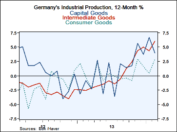 For the moment it appears that German industrial output is underpinned by the increase in intermediate goods output. Intermediate goods output is the only one of the three major categories showing persistent increases in its growth rate. Over 12 months intermediate goods output is growing at a 6% pace; that rises to an 8.8% pace over six months and to an 8.9% pace over three months. This is the same kind of pattern that we saw looking at German orders. So whatever's going on in the German economy, it is being echoed by trends in orders and in output. It's strange for intermediate goods to be leading the pack with both final goods sectors, consumer goods in capital goods, still struggling.