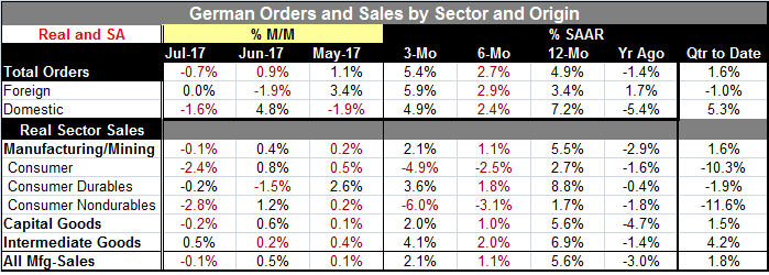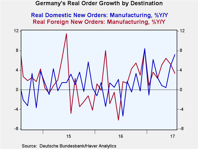 Germany's orders fell 0.7% m/m in July after a strong gain in each of the previous two months. The decline in orders was not anticipated because by all accounts German manufacturing has been doing pretty well. The PMI gauge, the ZEW experts, the IFO survey, the EU indexes and so on all have pointed to ongoing solid expansion. The drop in orders in July, however, is real and it is foisted on the German economy by a 1.6% drop in domestic orders. Domestic orders are coming off a very strong 4.8% gain in June which itself is now sandwiched between two declines.