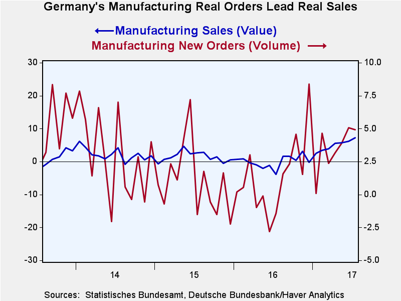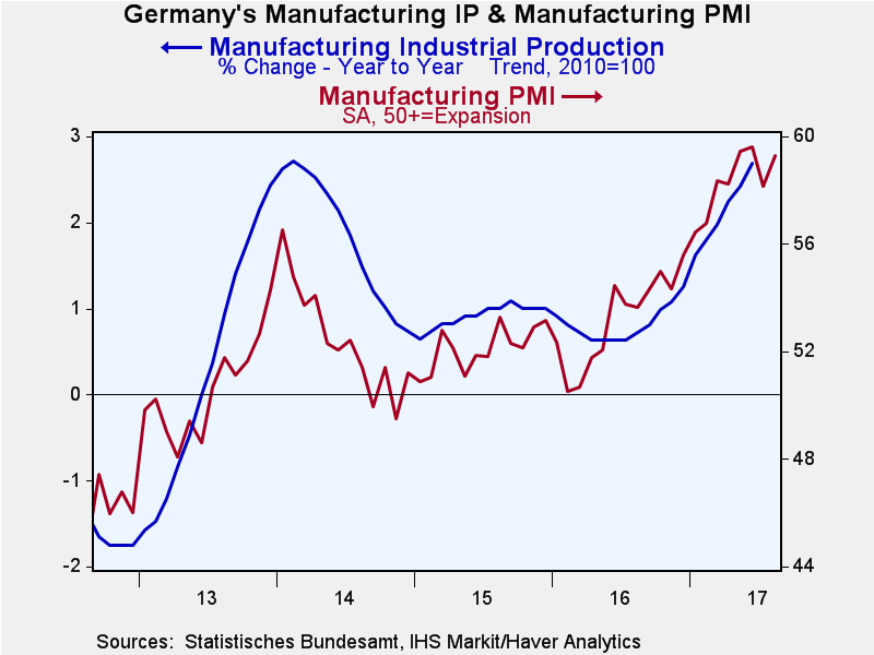The German manufacturing PMI gauge also tracks IP well (both are volume series) and both continue to point higher (see Chart to right). The smoothed manufacturing gauge and the PMI send a clear signal of ongoing expansion.