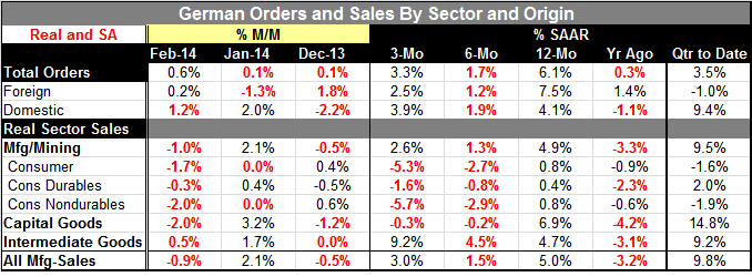 German orders rose by 0.6% in February after the downward revision of January's gain from 1.2% to 0.1%. As a result, orders over three months are rising at just a 3.3% annual rate. That's up from the 1.7% pace over six months but only about half of the pace of 6.1% over 12 months. In the quarter to date, orders are growing at a 3.5% annual rate. For Germany, the most competitive country in the euro area, these are relatively tepid results.