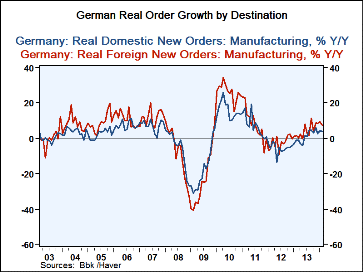 Foreign orders have been an important driver of German orders all year long. Foreign orders are up 7.5% over 12 months, compared with a 4.1% gain for domestic orders. However, foreign orders have been slipping. Over the most recent three months, domestic orders are holding their pace better than are foreign orders as domestic orders are growing at a 3.9% annual rate, compared to 2.5% for foreign orders.