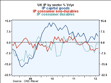 Germany remains the most competitive country in Europe. It has a huge price advantage on trade within the Zone even as Zone growth withers. Meanwhile, outside the zone, there is a pronounced slowdown in the making. Seeing output rise against the trend in orders suggests that there is some short term event in play that will have not follow through. The orders series does a good job over time in tracking the output series. The longer the period, the better it does. Over three months the orders series predicts 36% of the variance in output, over six months that rises to half the variance and over twelve months it rises further to 78% of the variance. And if we lead the orders series by three months the 12-monh prediction rises to 92% of the variance in MFG output.