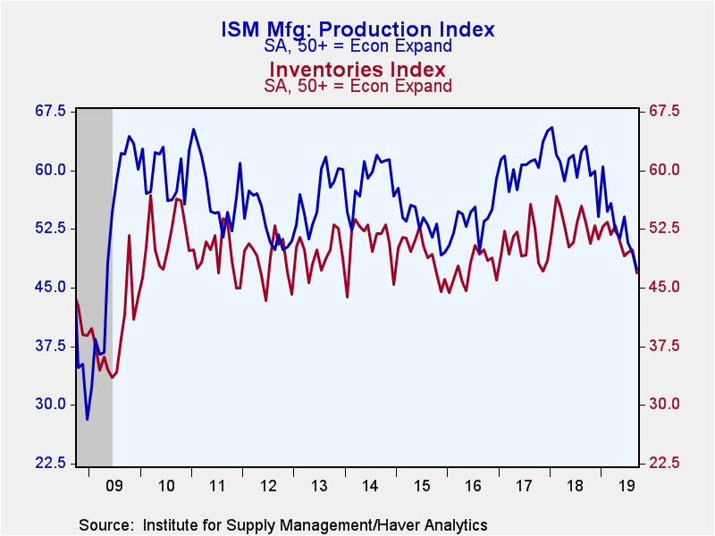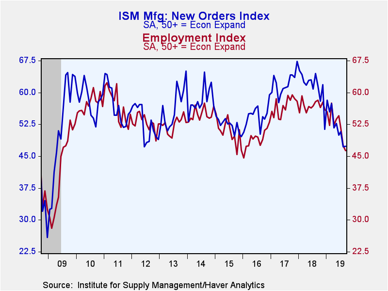 Most of the components of the ISM index deteriorated versus August. Production declined to 47.3, also the lowest level since the end of the last recession. Weakness developed as the inventory measure fell to 46.9, indicating the fourth consecutive month of inventory decumulation. The supplier deliveries suggested quicker product delivery speeds as it eased to 51.1, down from a high of 67.6 in June of 2018. Holding fairly steady m/m was the new orders figure at 47.3, though that was sharply below the high of 67.3 in December 2017.