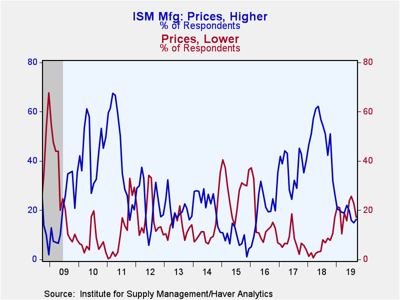 The prices paid series, which is not part of the composite index, improved slightly m/m to 49.7. That indicated price deflation for the sixth month this year. It remained below the high of 79.5 in May of 2018. A lessened 16% of respondents reported increased prices while 17% reported lower prices.