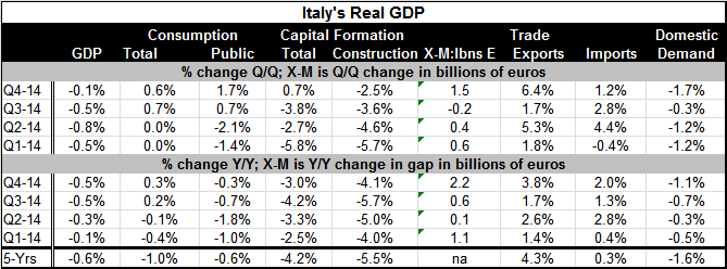 Italy continues to struggle. Its GDP fell in Q4 and is net lower year-over-year. GDP in Italy is falling as fast year-over-year in Q4 as it was in Q3. That is not progress. Public consumption rose at a 1.7% annual rate in Q4 2014 but [...]