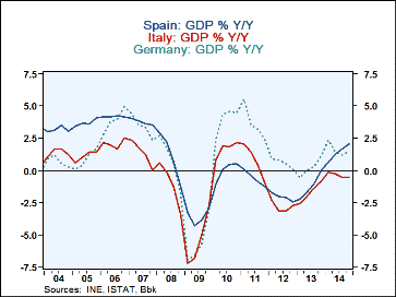 Italy is trailing Germany and Spain as you can see on the chart. Among the 11 earliest EMU members (excluding Luxembourg), Italy has the third lowest Q/Q growth rate and the worst year-over-year growth rate. Italy has had the worst year-over-year growth or been tied for it for three consecutive quarters.