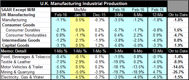 U.K. industrial production fell by 1.1% in February; it is showing sequential declines in output from 12-month to six-month to three-month, but it is not consistently getting even worse - that's something. However, consumer durable goods output shows sequential declines and sequential worsening; capital goods output shows sequential declines and sequential worsening. These are two important sectors that are both showing declines and where the declines are worsening. Intermediate goods show output's consistent deterioration but not quite sequential worsening. Only nondurable consumer goods output shows output increasing on all horizons, but the three-month growth rate has snaked down below the 12-month rate which itself is less than 1%. These are not great or reassuring trends for U.K. industry in any sector.