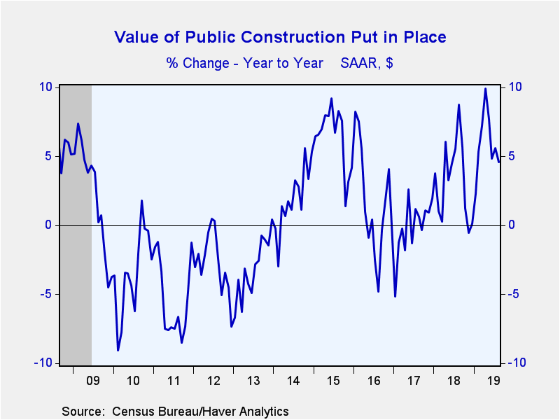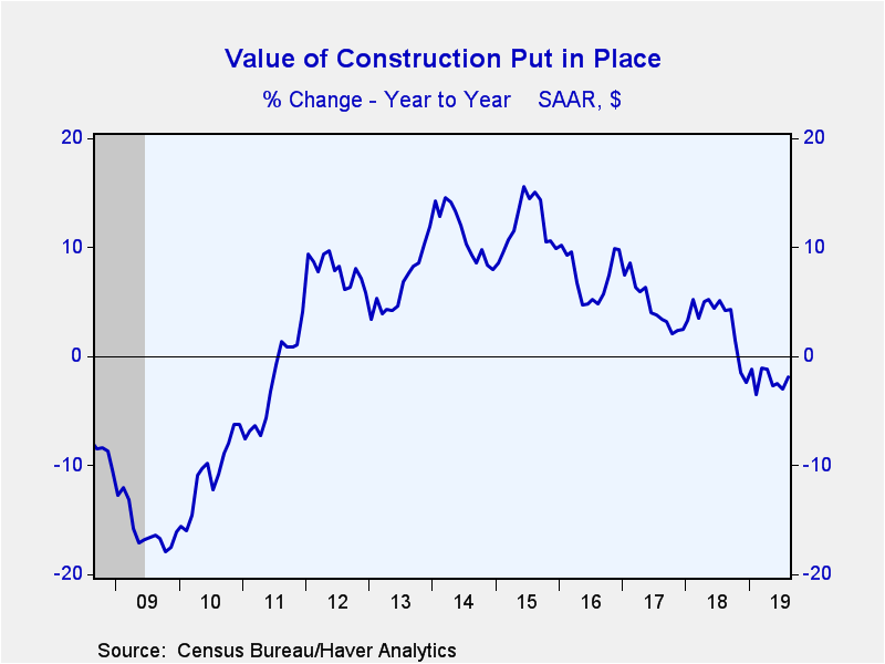 The value of construction put-in-place improved 0.1% (-1.9% y/y) during August following a little-revised stability in July. A 0.4% rise had been expected in the Action Economics Forecast Survey.