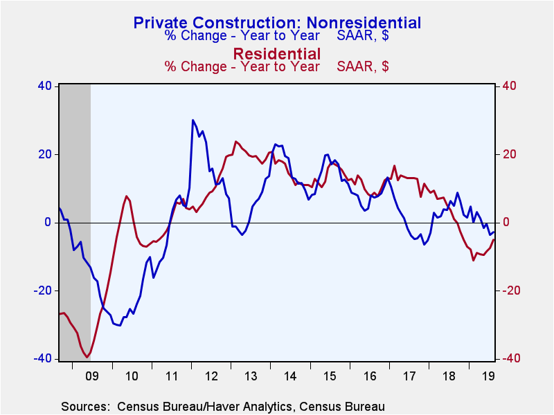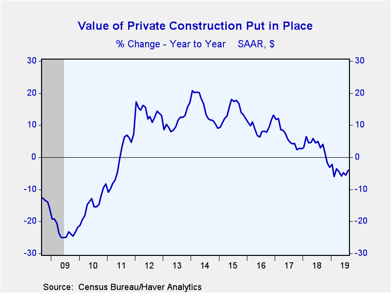 Construction activity in the private sector was unchanged (-4.0% y/y) following four consecutive months of decline. Residential construction rose 0.9% (-5.0% y/y) after a 0.6% gain. Single-family building jumped 1.4% (-6.6% y/y) after a like increase in July. The value of home improvements rose 0.8% (-6.4% y/y) after a 0.5% slip. Multi-family construction declined 0.9% (+7.4% y/y), the fifth monthly decline this year.