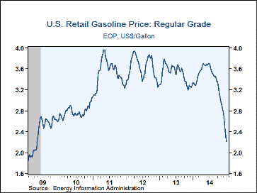 Energy prices remained under pressure last week as they have since last Spring. Average gasoline prices declined another 9 cents in the week ended January 5 to $2.21 a gallon. Prices have fallen by one-third during the last year and by 40% since their June high of $3.70 per gallon. Haver Analytics constructs factors adjusting for the seasonal variation in pump prices. The seasonally adjusted price declined to $2.47 per gallon last week from $2.59.