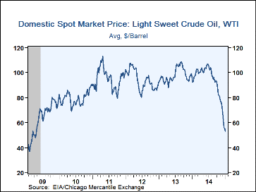 Crude oil prices also continued lower, falling to an average $53.39 per barrel (-44.7% y/y) in the week ended January 2 from $55.58 during the prior week. Yesterday, prices fell further to $50.04 per barrel. These levels compare to a June peak of $107.95. The seasonally adjusted price generated by Haver Analytics declined to $57.82 per barrel last week. Brent crude oil prices fell to $55.90 last week (-49.2% y/y) and were $51.08 yesterday.