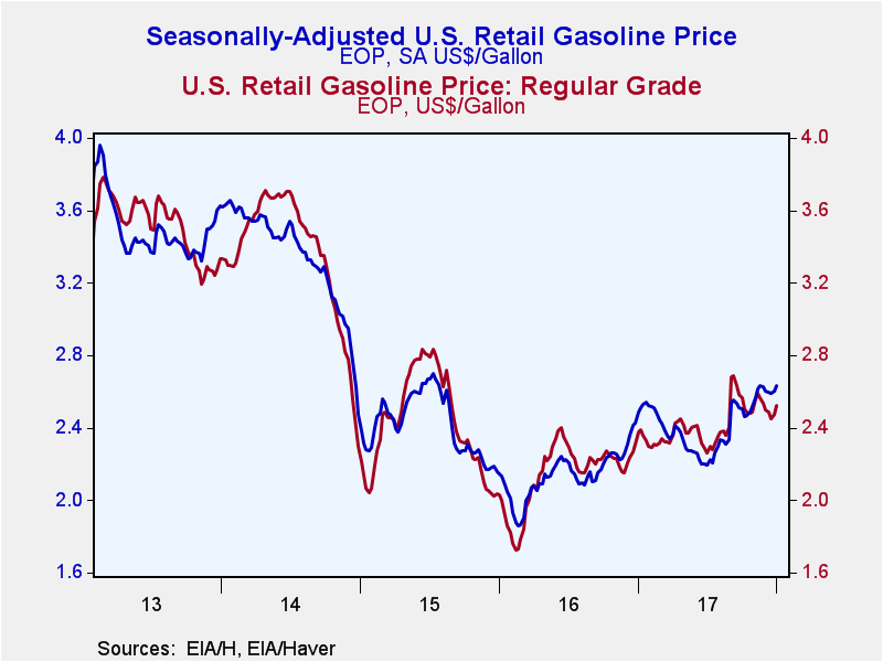 Retail gasoline prices increased to $2.52 per gallon (6.0% y/y) last week, the highest level since late November. Haver Analytics constructs factors adjusting for the seasonal variation in gasoline pump prices. At $2.64 per gallon, the seasonally adjusted gasoline pump price also was the highest level in seven weeks.