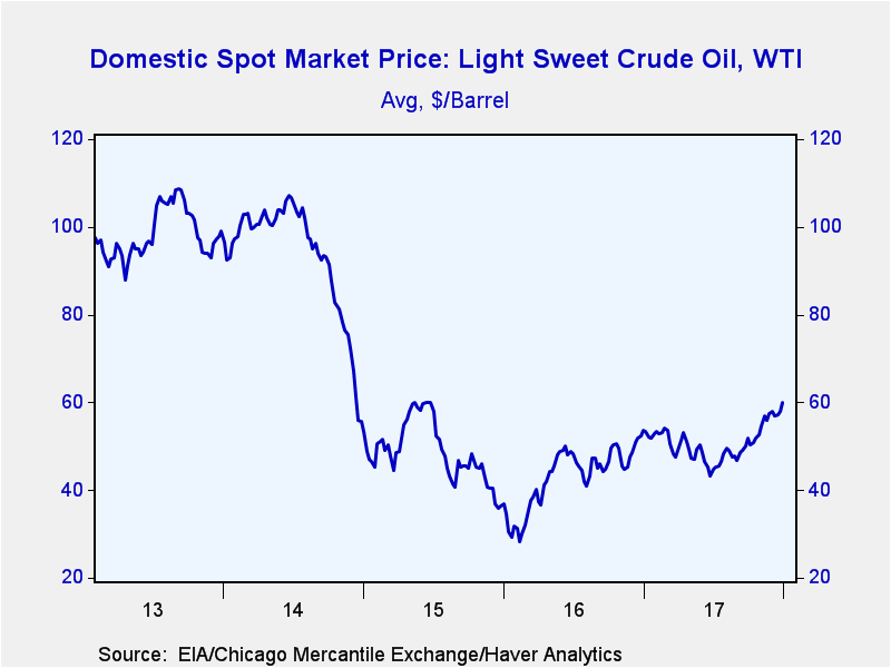 WTI crude oil prices strengthened to $59.86 (11.7% y/y) per barrel last week, the highest level since June 2015. Prices rose further yesterday to $60.37 per barrel. Brent crude oil prices increased to $66.04 per barrel last week and were $66.65 per barrel yesterday.