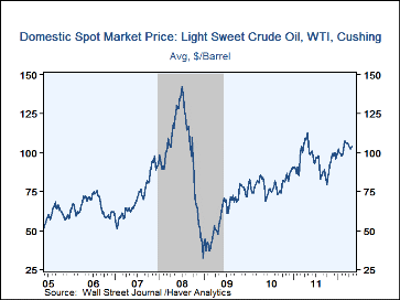 The price for a barrel of light sweet crude oil rose last week to $103.97 and remained up sharply versus the low of $79.71 this past October. Yesterday, the cost of crude rose further to $104.87 per barrel. Prices peaked at $113.93 last April. Brent crude increased last week to $117.89 per barrel and rose further to $119.08 yesterday.