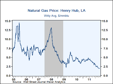 Natural gas prices rebounded last week to $2.00 per mmbtu but were still down 54.5% y/y. Yesterday, prices inched up further to $2.11 but remained off from the early-January 2010 peak of $6.50.