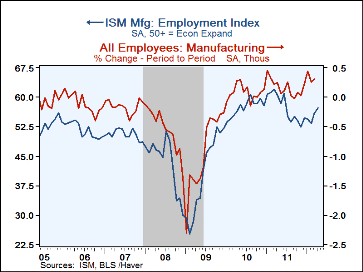 Changes in the component indexes were broadly positive, led by the gain in new orders to 58.2. That was followed by higher readings for production (61.0), supplier deliveries (49.2) and employment (57.3). During the last ten years there has been an 88% correlation between the employment series level and the m/m change in factory sector payrolls. The inventory index declined to its lowest level (48.5) since December.