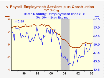 The seasonally adjusted employment index improved to 51.0, the fourth month above 50 this year. Since the series' inception there has been an 85% correlation between the level of the ISM nonmanufacturing employment index and the y/y change in payroll employment in the service producing and construction industries.