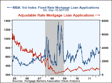 The Mortgage Bankers Association reported that its index of total mortgage applications nudged up 0.1% w/w to 698.2 (52.2% y/y). That left the average level in April down 0.9% from March and down 10.9% from the February high. Applications to refinance led the decline with a 0.7% w/w dip (+77.2% y/y) that followed a 5.6% drop during the prior week. It pulled the April average 1.2% below March and 15.8% below February. Home purchase applications offset the w/w decline with a 2.9% rise (4.4% y/y). During April they've risen 0.5% from March and 10.9% from the February average. Fixed interest rate loan applications were unchanged w/w and remained down sharply from the January peak while variable rate loan applications moved sideways.