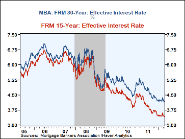 The effective rate on fixed-interest, conventional 15-year mortgages again was roughly unchanged at its low of 3.41% but was down from its 4.50% high in February of last year. The effective rate on a 30-year fixed rate loan also was roughly stable w/w at 4.18%. On a 30-year Jumbo loan the effective rate nudged up to 4.43%. Though it's narrowed slightly of late, the spread between 15- and 30-year loan rates continued wide by historical standards. The effective interest rate on an adjustable 5-year mortgage also ticked up to 3.00% and still was down from its 3.93% high during February of last year.