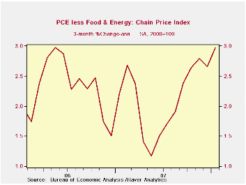 The PCE chain price index rose a firm 0.4% lifted by higher energy prices. That raised the y/y gain to 3.7%, the quickest since mid-2005. The rise in the core PCE price index was ahead of expectations. A 0.3% gain beat expectations for a 0.2% rise but, more significant, was an acceleration in the three month growth rate to 3.0% that was its fastest since late 2001 and up by half from last year.