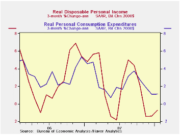 Adjusted for prices, disposable personal income squeaked out a 0.1% gain last month. The weak rise followed a like increase in December but two months of decline preceding that. It left the three-month growth rate at a negative 0.7% (AR).