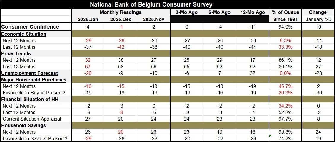 The National Bank of Belgium index for January 2026 rose to +4 from -1 in December, stronger than its November 2025 reading of +2. The survey value is exceptionally strong, lying in the top 6% of all observations back to 1991, even as the survey contains significant variations that range from strong to quite weak across its various components. What is most notable is that the index itself is extremely high-ranking; the current situation appraisal is also quite high-ranking; and, that the forecast for unemployment embedded in this survey is at a 35-year low. Considering current circumstances, against the events of the last 35 years, that's a rather remarkable finding especially considering the world situation.