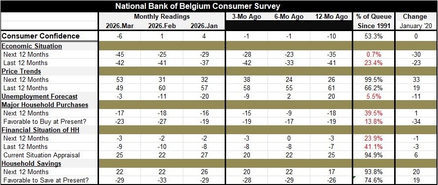 The Belgian consumer may be on the edge of a sudden deterioration based on responses to the National Bank of Belgium Consumer Survey for March. The consumer confidence reading registered at -6 in March compared to +1 in February. And on data back to 1991, this gives the consumer confidence metric a ranking in its 53rd percentile, slightly above the median for this span. For ranked data, the median occurs at the 50th percentile.