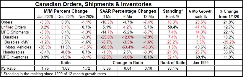 Canadian orders fell by 3.3% in January after running flat in December and falling by 1.1% in November.