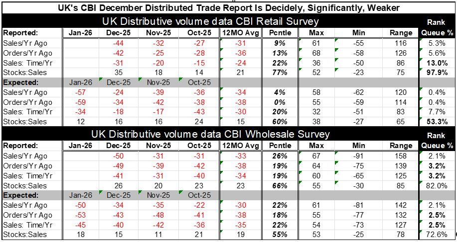 The new UK Confederation of British Industry (CBI) survey on the distributive trades sector shows a sharp weakening of an already weak survey for December and for the outlook into January of 2026.