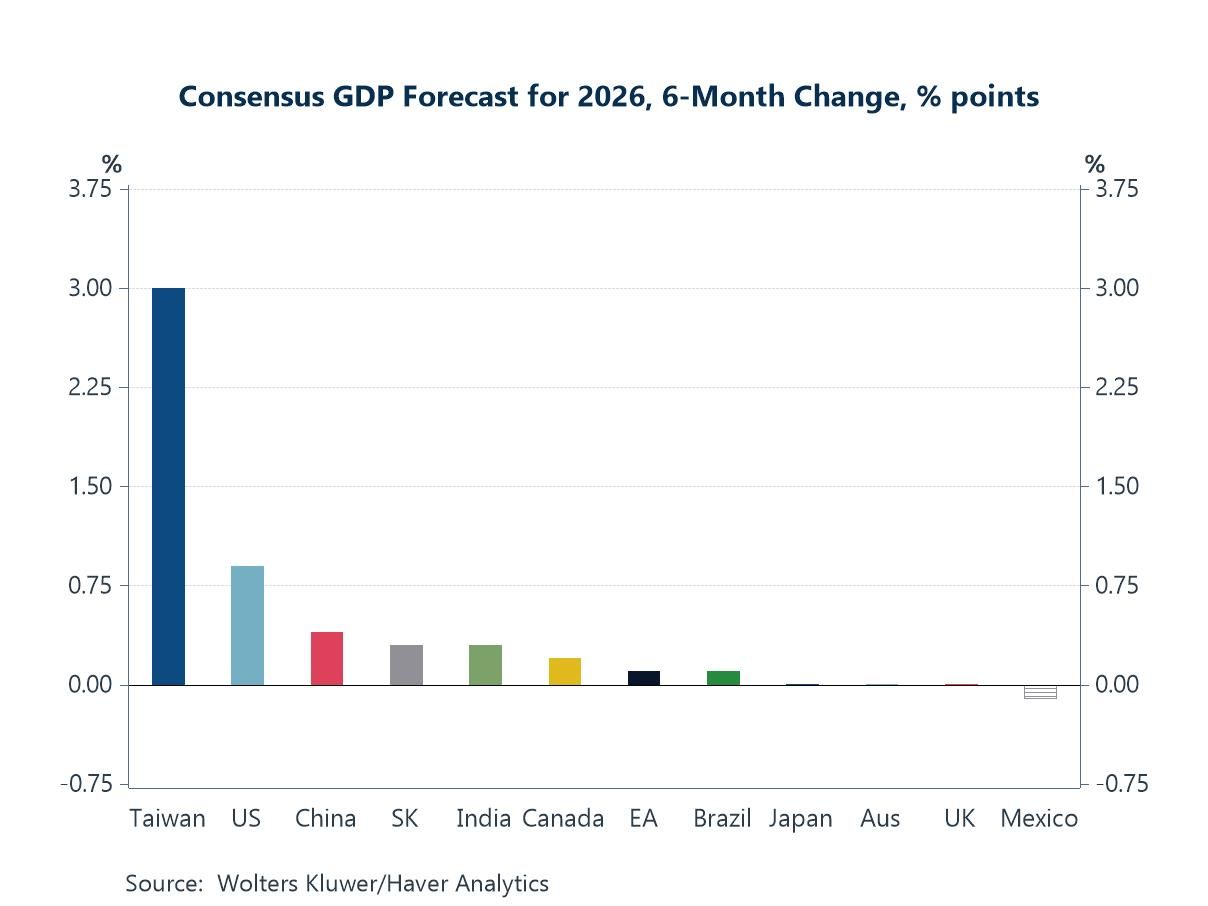 The Blue Chip Growth Consensus The first chart this week highlights a striking feature of recent forecast revisions: the outperformance of Asia, and Taiwan in particular. Over the past six months, Blue Chip panelists have upgraded their 2026 GDP growth forecasts most aggressively for Taiwan, far outpacing revisions elsewhere. This reflects the central role Taiwan plays in the global AI supply chain, especially in advanced semiconductors, where demand linked to data centres, AI accelerators and high-performance computing continues to strengthen. More broadly, positive revisions across parts of Asia suggest that the current AI-driven investment cycle is not just a US story, but one that is increasingly feeding through global tech supply chains, boosting exports, industrial production and capital spending across the region. In contrast, forecast changes elsewhere remain far more muted, underscoring how tightly the near-term growth impulse from AI is concentrated in economies most directly exposed to the semiconductor and hardware build-out.