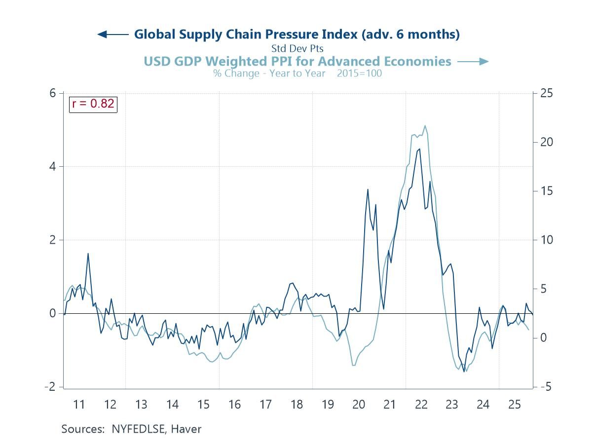 Global Supply Chain Pressures The fourth chart places recent inflation dynamics in a broader supply-chain context and offers little evidence that current US tariff policies are materially exacerbating global bottlenecks. The Global Supply Chain Pressure Index has remained close to historical norms in recent months, a sharp contrast with the extreme dislocations seen during the pandemic period. Consistent with this, producer price inflation across advanced economies has remained muted, reinforcing the tight relationship between supply-chain stress and upstream price pressures. While tariffs may still influence relative prices at the margin and contribute to sector-specific adjustments, the data do not point to a broad-based resurgence in supply-chain pressures of the kind that would generate renewed, systemic inflationary pressure.