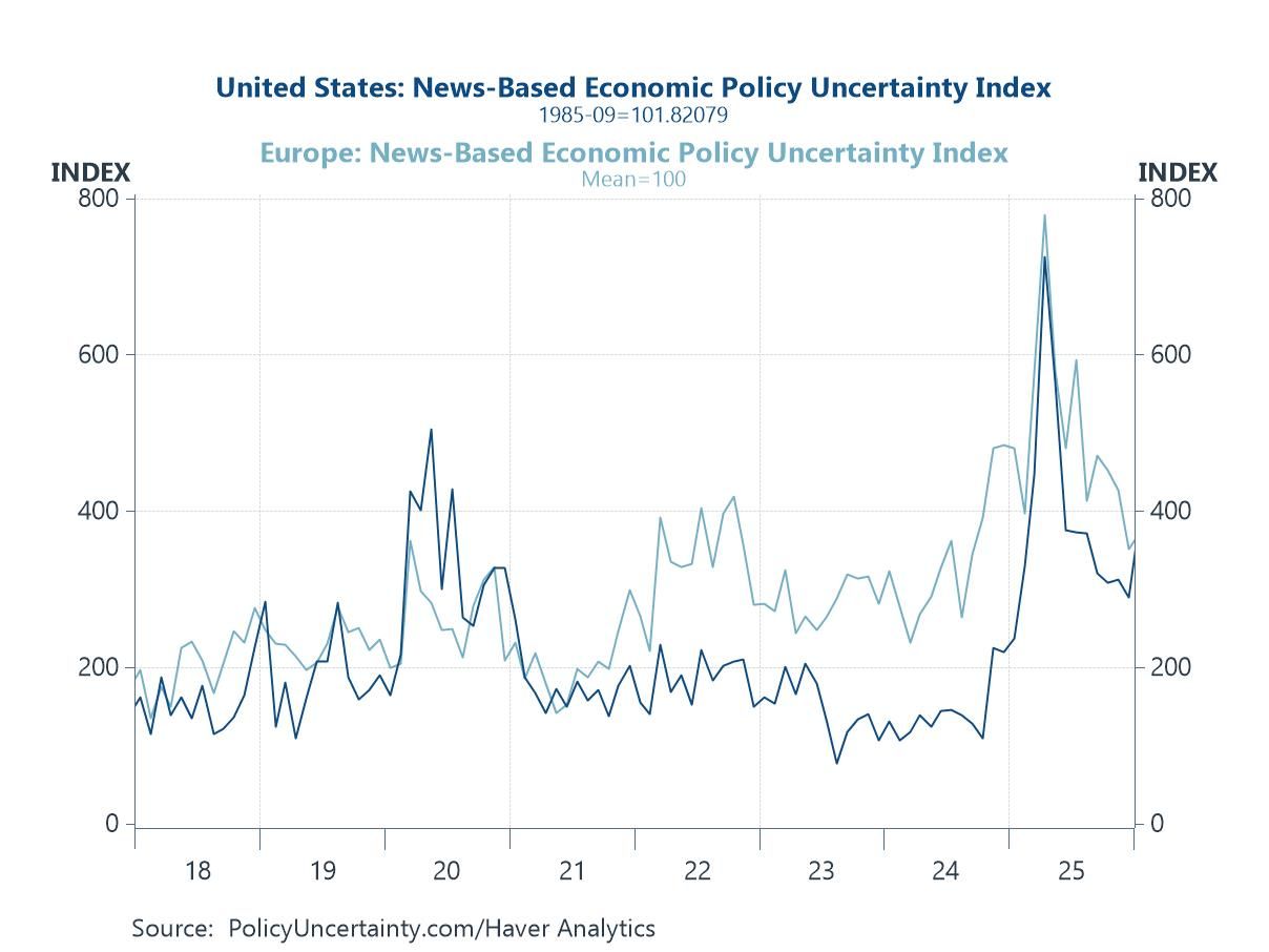 Uncertainty in the US versus Europe The fifth chart highlights a striking shift in the global policy uncertainty landscape. The US news-based economic policy uncertainty index has risen sharply and is now approaching levels more typically associated with Europe — a vivid contrast with the post-GFC and post-pandemic period, when US policy uncertainty was consistently well below European norms. This convergence likely reflects a combination of factors: renewed uncertainty around US trade policy and tariffs, questions over fiscal sustainability and debt dynamics, and growing debate around institutional independence, including the role of the Federal Reserve. At the same time, political polarisation and an increasingly unpredictable policy environment have become more prominent features of the US backdrop. The implications are potentially important for markets. A sustained rise in policy uncertainty would argue for a higher risk premium on US assets, particularly if it begins to influence corporate investment decisions, capital flows or the perceived safe-haven status of US markets.