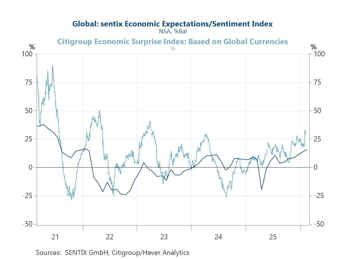 While markets have been unsettled at times by shifting policy expectations, geopolitical noise and questions around valuation, underlying global macroeconomic signals remain broadly supportive. Upgrades to Blue Chip consensus growth forecasts for parts of Asia — led by Taiwan — point to the tangible impact of the AI-driven tech cycle, a theme reinforced by the sharp rebound in semiconductor exports from South Korea (charts 1 and 3). At the same time, revisions to inflation forecasts underline a growing divergence in monetary policy paths, with easing still expected in the US and UK, while tighter stances persist elsewhere (chart 2). Importantly, there is little evidence so far that global supply-chain pressures are re-emerging in a way that would reignite inflation, notwithstanding lingering trade policy tensions (chart 4). Against this backdrop, rising policy uncertainty — particularly in the US — stands out as a potential source of risk, with implications for asset pricing and risk premia (chart 5). Yet the improvement in global sentiment surveys and a continued run of positive economic surprises suggest that markets are responding not just to policy noise, but to a genuinely resilient and improving macroeconomic environment (chart 6).