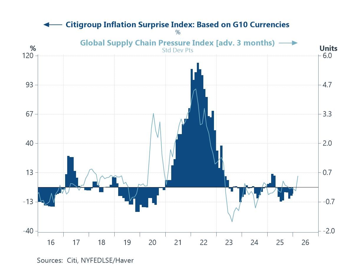 Supply chain pressures and inflation surprises The NY Fed’s Global Supply Chain Pressure Index has remained subdued in recent months, reinforcing the view that supply-side frictions are no longer a material source of inflation risk. After the extreme dislocations of 2021–22, the index has settled close to, and at times below, its long-run average, consistent with largely normalised delivery times, inventories and transportation costs. The latest reading for December 2025, however, does point to some marginal tightening in supply-chain conditions, though from very low levels and still well within historical norms. Still, this modest firming has so far coincided with a broadly benign profile for inflation surprises across the G10. While geopolitical risks and trade fragmentation remain medium-term considerations, the current signal from global supply chains continues to point to limited immediate upside pressure on inflation.