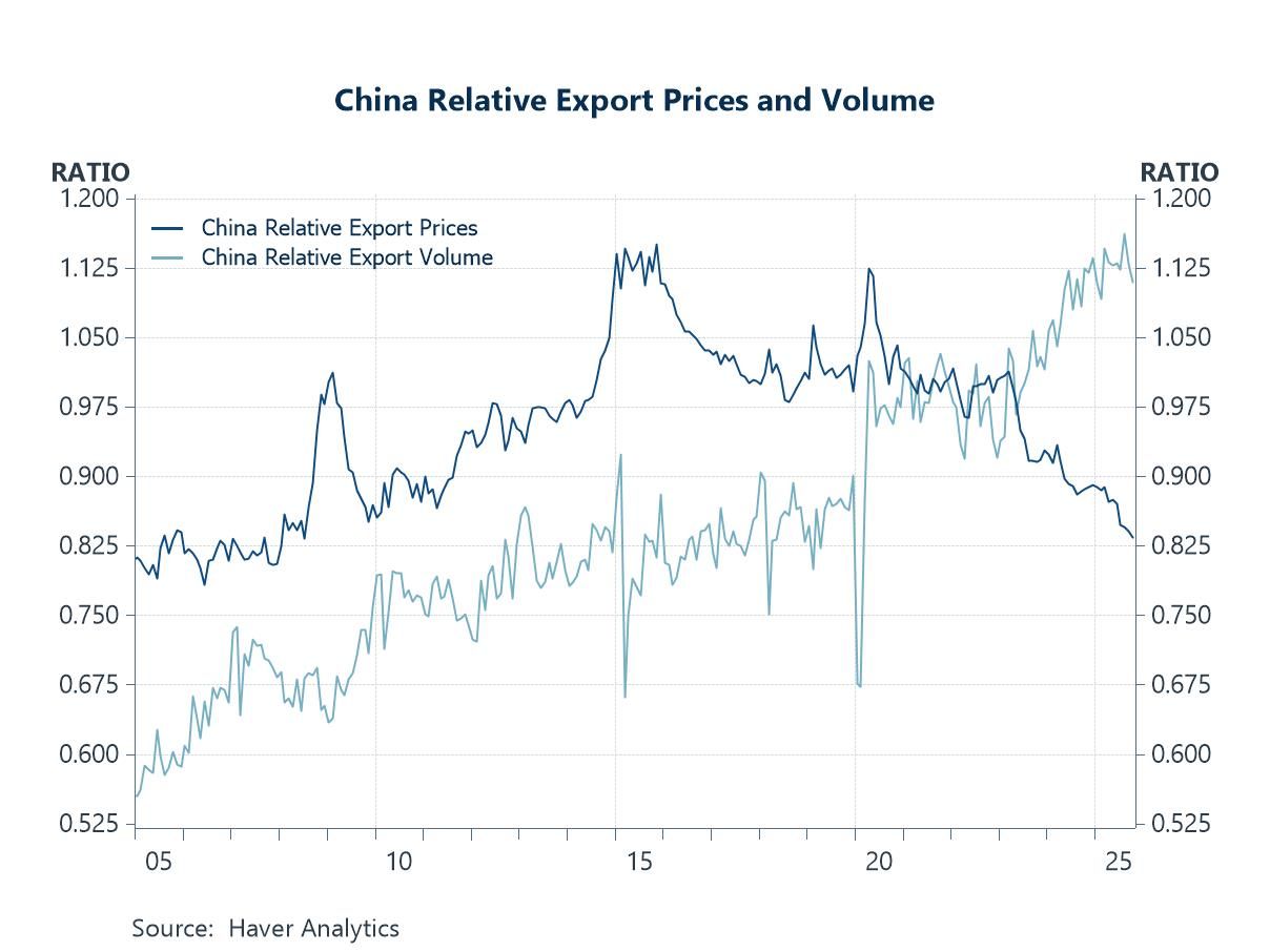 China’s excess capacity and traded goods price disinflation China’s export sector looks set to remain a key swing factor for the global economy in the year ahead, not least because of persistent surplus manufacturing capacity and weak domestic demand. As the chart illustrates, periods of falling relative export prices have tended to coincide with rising export volumes, highlighting China’s ability — and willingness — to clear excess capacity through external markets. With producer prices still under pressure and policy support focused more on supply than demand, the risk is that excess capacity is once again exported via more aggressive price competition, rather than absorbed domestically. If sustained, this dynamic would reinforce global disinflation forces, intensify competitive pressures on manufacturers elsewhere, and heighten trade tensions, particularly in sectors already sensitive to Chinese overcapacity such as autos, machinery and green technologies. In that sense, China’s export pricing behaviour may prove as important for the global inflation and trade outlook in 2026 as any shift in domestic growth momentum.