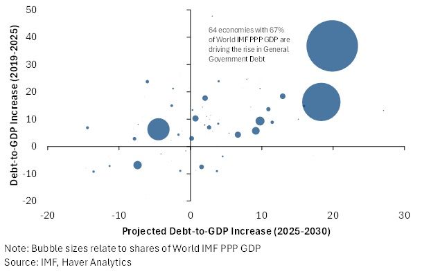 Public sector indebtedness This next chart, drawn up by the IMF, underlines a defining feature of the post-pandemic macro landscape: public debt is not only higher than before Covid, but is set to keep rising — and at a faster pace — with the largest economies doing much of the heavy lifting. The clustering of the biggest bubbles in the upper-right quadrant shows that countries accounting for roughly two-thirds of global GDP have already experienced sizeable increases in debt-to-GDP ratios since 2019 and are projected to see further rises through the second half of the decade. This combination of elevated starting points and ongoing fiscal expansion reflects the persistence of structural pressures — higher interest costs, ageing populations, defence spending and climate-related investment — rather than temporary crisis measures. For the global economy, the implication is a world in which fiscal policy remains active but increasingly constrained, raising difficult questions about debt sustainability, the tolerance for higher real interest rates, and the scope for counter-cyclical fiscal support when the next downturn arrives.