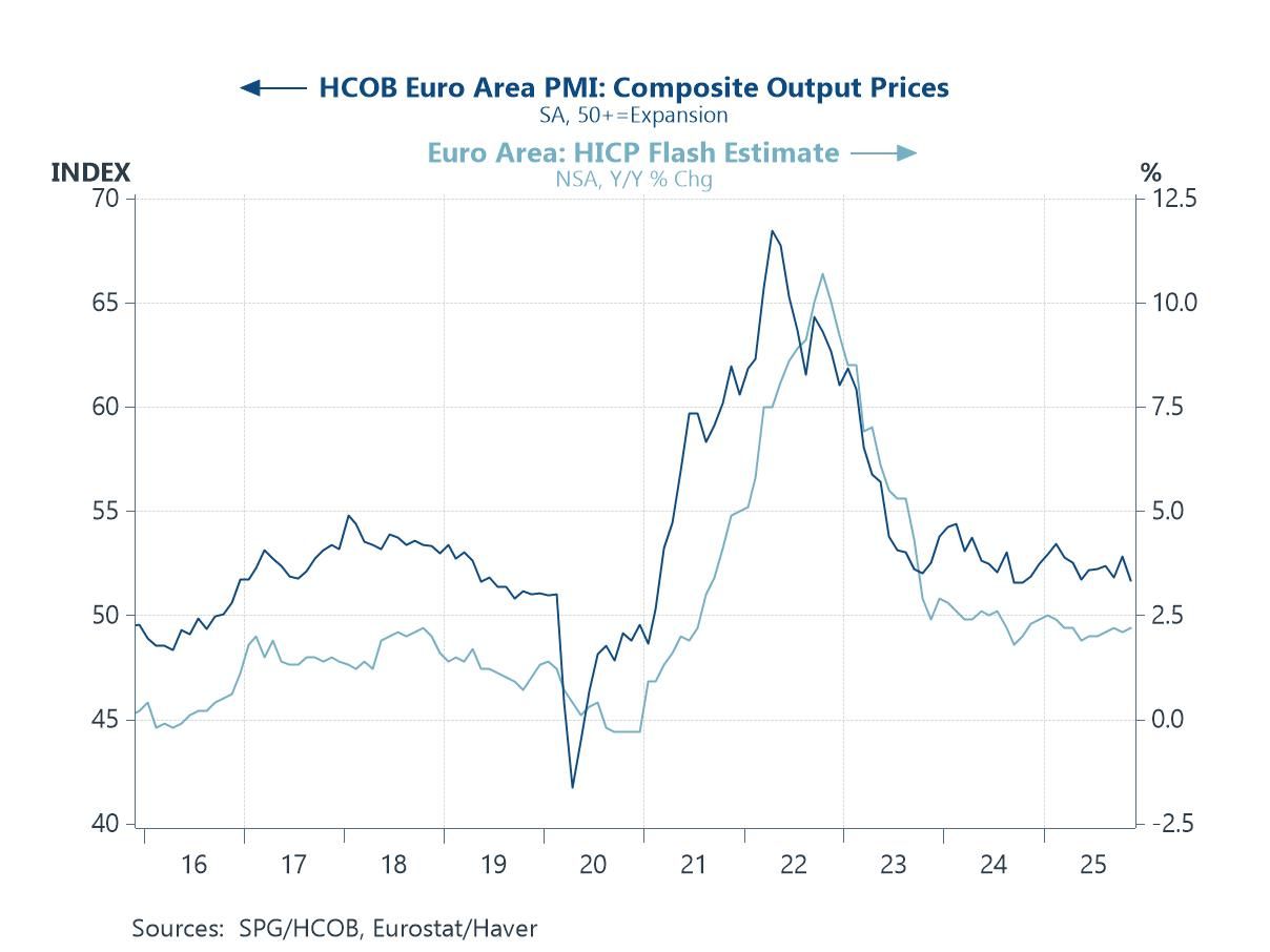 Inflation in the euro area The euro area’s disinflation trend has continued to progress, but the latest data underline why the ECB remains cautious about endorsing a more aggressive easing path. Composite output price pressures from the PMI survey have settled into a narrow band consistent with only modest disinflation, while the flash HICP estimate, though dramatically lower than its 2022 peak, appears to be levelling off rather than pushing decisively back toward target. This combination of sticky underlying inflation and still-fragile growth keeps the ECB in a delicate position: policy is no longer restrictive, but not clearly loose either, and the Governing Council has been careful to stress that further meaningful rate cuts will require clearer evidence that price dynamics are on a sustained downward trajectory. For now, the data suggest a eurozone economy that has stabilised, but with inflation still just firm enough to prevent the ECB from moving more decisively.