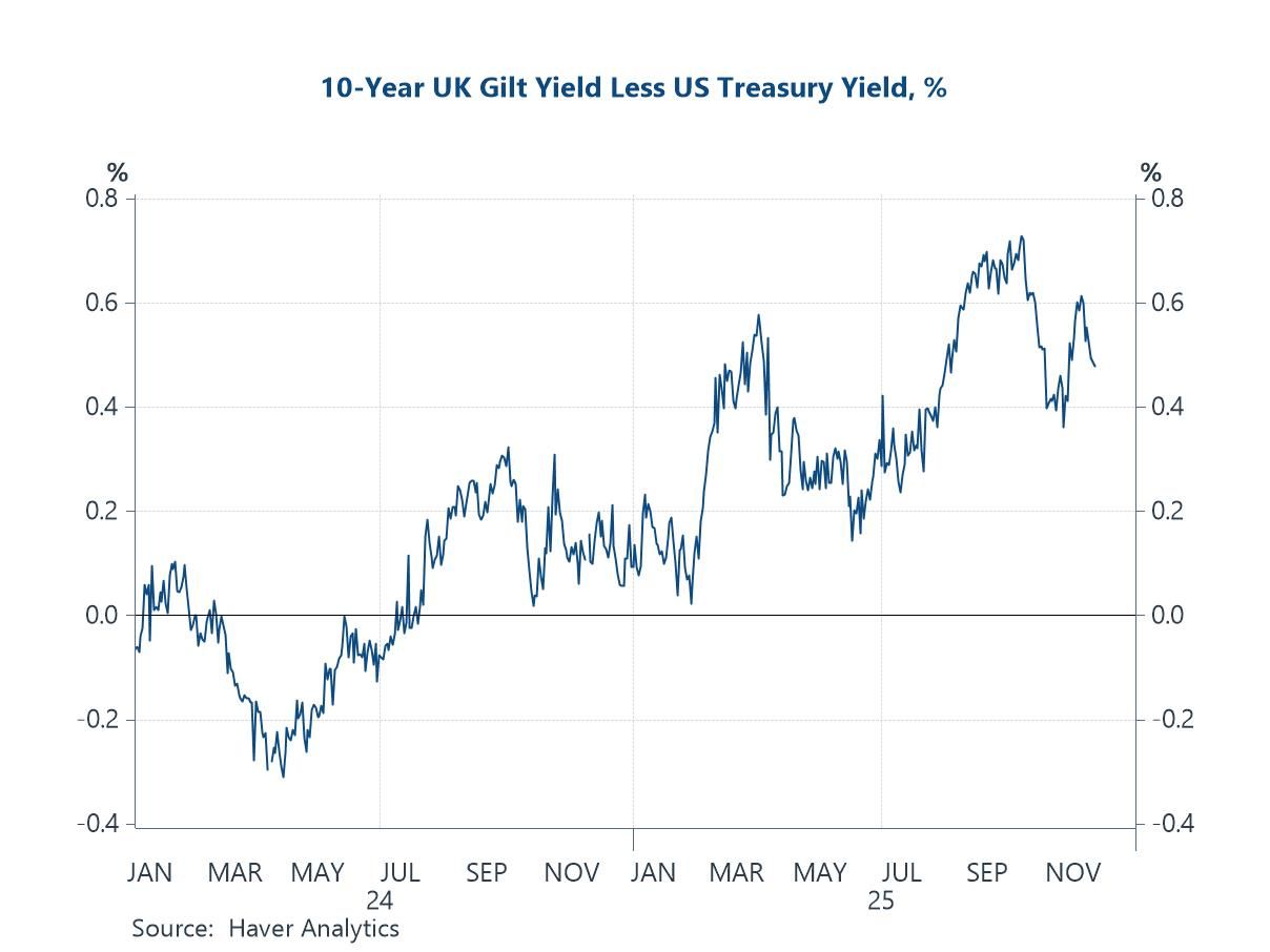 UK government debt The spread between 10-year UK gilts and US Treasuries has narrowed notably in recent weeks, unwinding part of the sharp premium that had built up through the summer and early autumn. This spread effectively represents the additional compensation investors demand for holding UK sovereign debt, and its further modest decline since the UK Budget last week suggests some easing of the political and fiscal risk premia that had accumulated earlier in the year. However, rather than reflecting improved confidence or clearer fiscal signalling, this move arguably appears driven more by the Budget’s explicit fiscal tightening and the associated downgrade to the UK’s growth prospects. Markets have interpreted the consolidation package—mainly through higher taxes—as dampening future demand, reducing inflationary pressure at the margin, and thereby lowering the expected path for UK gilt yields relative to Treasuries.