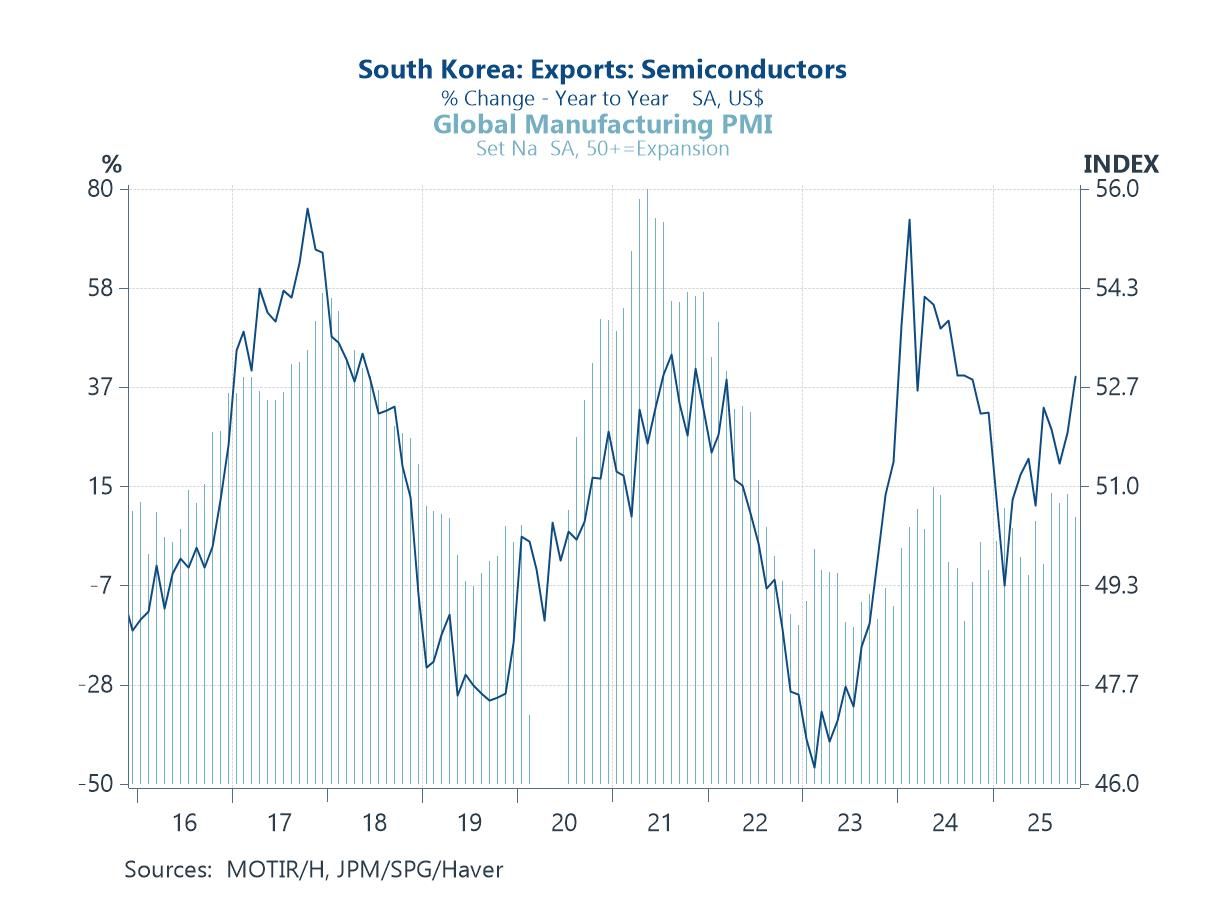 South Korea’s trade South Korea’s semiconductor export rebound continues to highlight how strongly the AI investment boom is feeding into global manufacturing. Chip exports, long a bellwether for the broader tech cycle, have swung firmly back into positive territory, historically a sign of improving global factory activity. The global manufacturing PMI has edged higher alongside this upswing, but it is worth noting that the PMI is still only pointing to very mediocre growth overall. In that context, the resurgence of semiconductor trade stands out even more clearly as one of the few genuine tailwinds in an otherwise subdued industrial landscape. For export-oriented Asian economies in particular, the AI-driven demand for advanced processors and memory chips is providing an important counterweight to broader global softness.