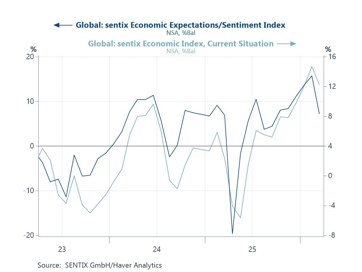 Sentiment surveys The picture becomes somewhat less reassuring when we turn to global sentiment indicators. The latest Sentix global economic expectations index shows a sharp deterioration in March, interrupting what had been a gradual improvement in global economic sentiment over the past year. Notably, the survey period coincided with the early stages of the recent escalation in tensions in the Middle East, suggesting that rising geopolitical risks may already be weighing on investor and analyst expectations. While the current conditions index remains relatively firm—consistent with the still-resilient growth outlook seen in the Blue Chip forecasts—the sudden downward lurch in expectations is potentially more concerning. Historically, sharp declines in forward-looking sentiment indicators such as this have sometimes served as early warning signals of a softening global growth environment, particularly when they coincide with rising energy prices and heightened geopolitical uncertainty.