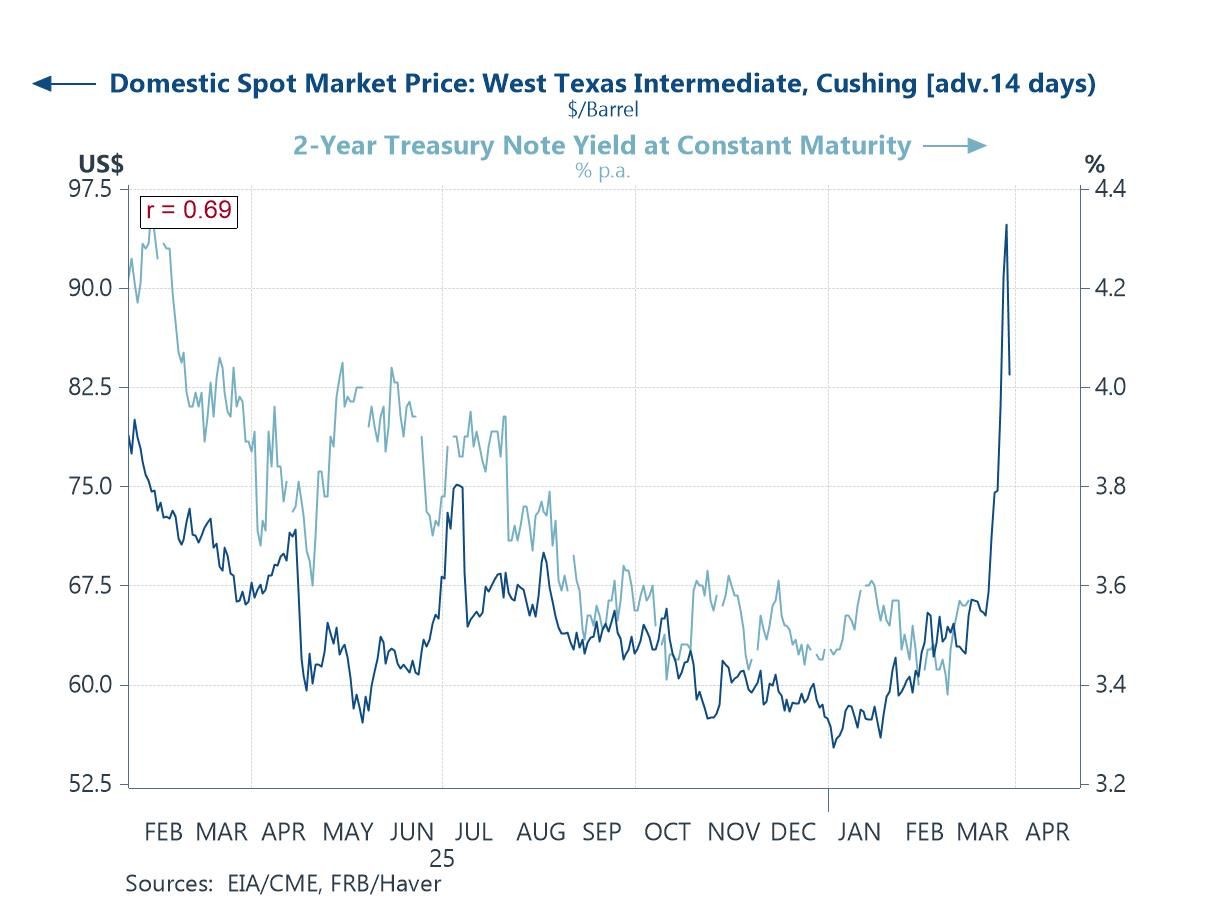Oil prices and short-dated yields The next chart highlights the close relationship that often emerges between energy prices and expectations for U.S. monetary policy. Over the past year, movements in the price of West Texas Intermediate crude have tended to be mirrored—albeit imperfectly—in shifts in the yield on two-year US Treasury notes, a market-based proxy for expectations about the Federal Reserve’s policy path. The correlation between the two series has been relatively strong, reflecting the fact that oil price swings can influence inflation expectations and therefore the outlook for interest rates. Yet despite the recent sharp rise in oil prices associated with the escalation of tensions in the Middle East, there has so far been no comparable move higher in two-year Treasury yields. This relative stability suggests that financial markets may be assuming that the latest oil shock will prove temporary or, at least, insufficient to materially alter the Federal Reserve’s policy trajectory.