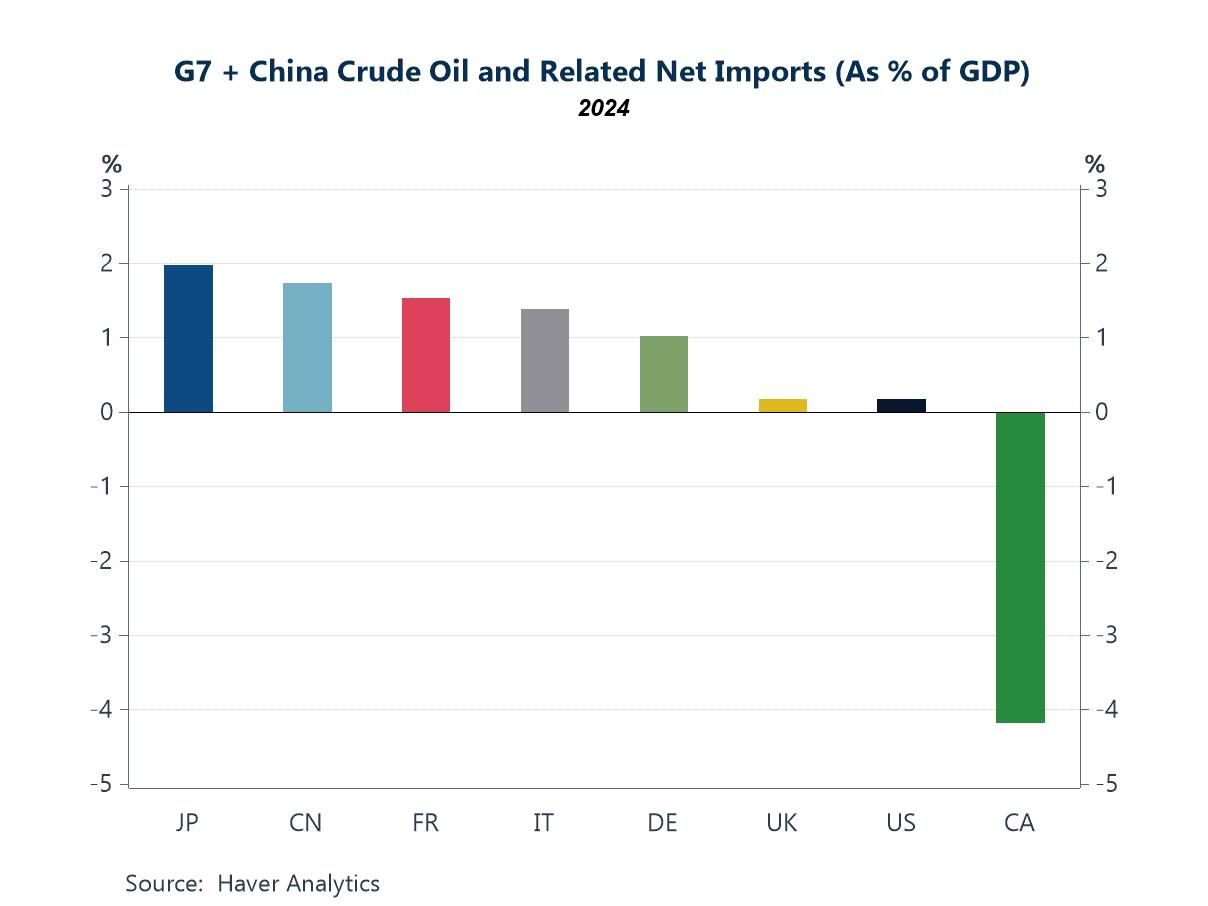 Oil exposure Staying with the theme of Middle East instability, the next chart highlights the varying degree to which major economies remain exposed to fluctuations in global oil markets. Measured as a share of GDP, Japan, China and several major European economies remain significant net importers of crude oil, leaving them more vulnerable to sustained increases in energy prices. Germany, France and Italy all retain notable import dependencies, while the United Kingdom’s exposure is comparatively modest. By contrast, the United States is now close to balance in crude trade, reflecting the transformation brought about by the shale revolution, while Canada stands out as a substantial net exporter. These differences matter in the current environment. Should geopolitical tensions lead to a sustained rise in oil prices, the macroeconomic burden would likely fall most heavily on the large importing economies, particularly in Asia and parts of Europe, where higher energy costs could weigh on growth and complicate the inflation outlook.