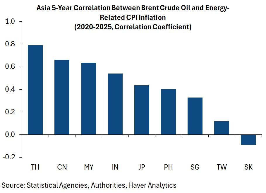 Oil prices and inflation The final chart stays with the theme of Middle East instability by highlighting the extent to which oil price movements tend to feed through into inflation dynamics across Asia. The five-year correlations between Brent crude prices and energy-related CPI inflation are positive and, in several cases, quite strong. Thailand, China and Malaysia show particularly high sensitivities, suggesting that swings in global oil prices are quickly reflected in domestic energy costs. India and Japan also display meaningful correlations, while the relationship is somewhat weaker in Singapore and Taiwan and even slightly negative in South Korea over this period. The broader message is that oil shocks rarely remain confined to energy markets alone. In many Asian economies, they transmit relatively quickly into inflation, potentially complicating monetary policy decisions if geopolitical tensions were to drive a sustained rise in crude prices.