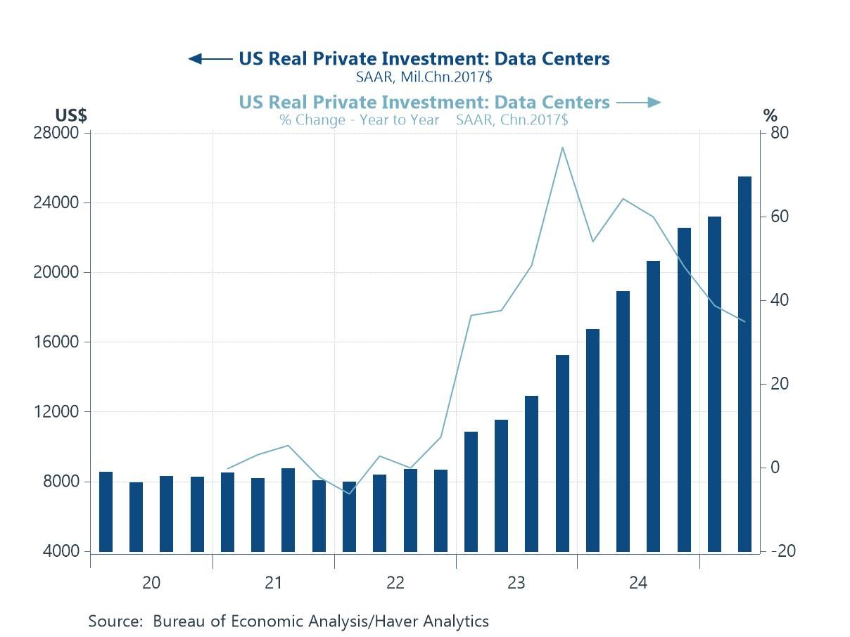 The US economy and AI That tech-tailwind shows up most clearly in the US, where the semiconductor upcycle is feeding directly into an AI-infrastructure boom. Real private investment in data centers has surged—an arms race to stand up AI capacity—making it one of the biggest (and least anticipated) contributors to US capex and GDP in recent quarters. The step-change since 2023 is striking: spending has climbed well beyond its pre-AI trend while year-on-year growth has remained elevated, reflecting orders for servers and accelerators, grid connections, specialized construction, and associated software and networking. In short, the same forces lifting Taiwan’s outlook are echoing through US investment via data-center build-out, helping to prop up aggregate growth even as other business spending lines look more pedestrian.