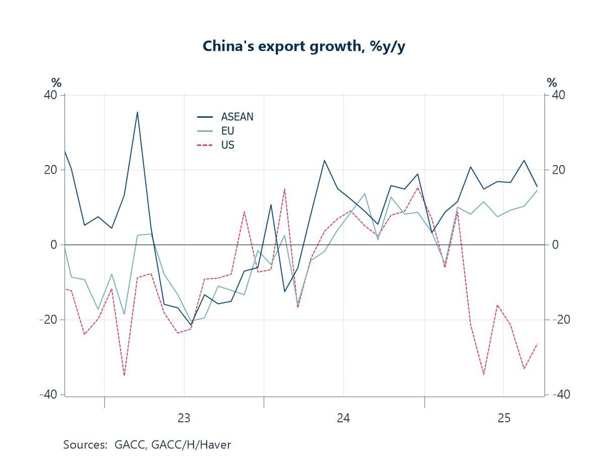 China’s trade China’s latest trade release this week surprised to the upside, but the regional mix matters. The chart shows the story: exports to ASEAN and the EU have pushed firmly back into positive double-digits this year, tracking the tech/semiconductor upcycle and demand tied to electronics, batteries and intermediate machinery. By contrast, growth of shipments to the US remain deeply negative on a year-ago basis, reflecting tariff headwinds, export controls and some demand diversion through third markets. In short, the headline beat masks a widening geographic split—Asia and parts of Europe are doing the heavy lifting, while the US lane stays a drag—underscoring how the tech cycle is lifting China’s regional partners even as policy frictions keep trans-Pacific trade subdued.