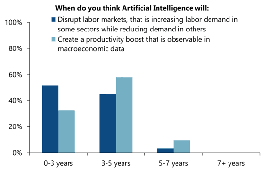 AI and productivity The rub, of course, is whether this investment wave translates into productivity—and when. In the latest Blue Chip Economic Indicators survey, respondents think labor-market disruption will arrive before macro-visible efficiency gains: around half expect AI to reshape labor demand within 0–3 years, but fewer see a measurable productivity boost on that horizon; most place that in 3–5 years, with a meaningful tail beyond. That timing gap is the core risk—capex and workforce churn arrive early while the payoff lags—leaving growth flattered by construction and equipment rather than true total factor productivity. Diffusion outside tech, skills and organizational change, data quality, and energy/grid constraints all raise the execution bar. In short, the macro story hinges on whether today’s AI build-out converts into broad, measured productivity before the cycle—or policy patience—runs thin.